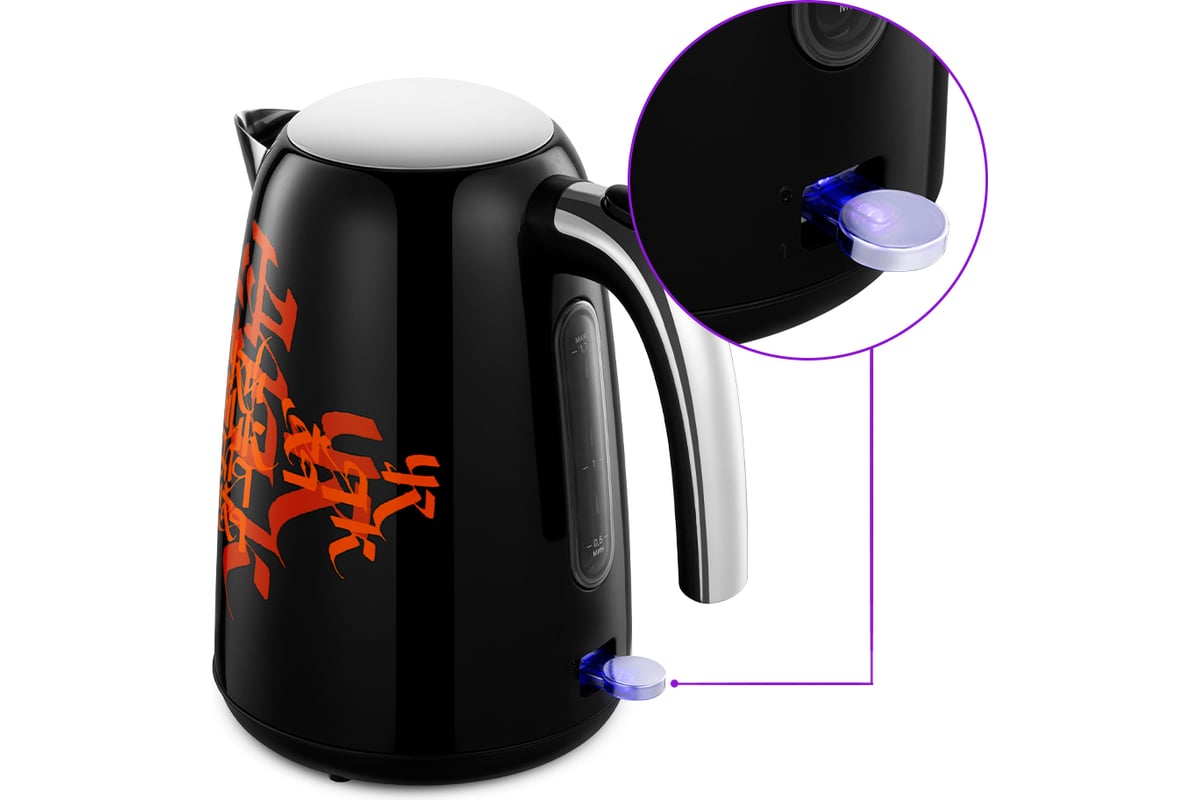 Кнопка открывания крышки расположена на ручке чайника, а переключатель — под ручкой. При включении загорается подсветка переключателя.