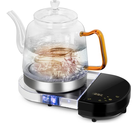 Корпус и крышка чайника сделаны из стекла. Стекло является экологически чистым материалом, и не будет выделять токсичных веществ в отличие, например, от пластика. У чайника есть стеклянная подставка с панелью управления и сенсорными кнопками. Стеклянная подставка с центральным контактом дает возможность располагать на ней чайник в любом положении, обеспечивая вращение на 360°. Во время работы чайника внутри подставки загорается световой индикатор.