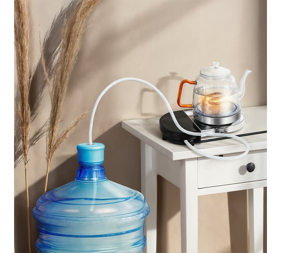 В данной модели чайника есть функция автоналива, для этого в комплекте идет специальный шланг. Чтобы налить воду, установите шланг к патрубку подставки, второй конец шланга — к емкости с водой и нажмите на кнопку панели управления: вода из емкости будет подкачиваться помпой в чайник.