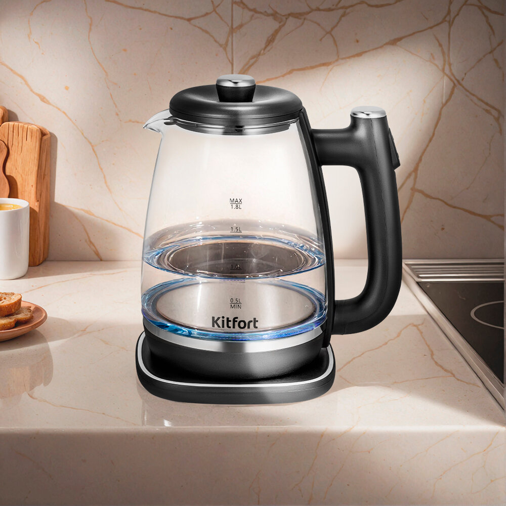 Электрический чайник Kitfort КТ-6728 предназначен для кипячения воды дома, в офисе, на даче. Ёмкость чайника составляет 1,8 л.