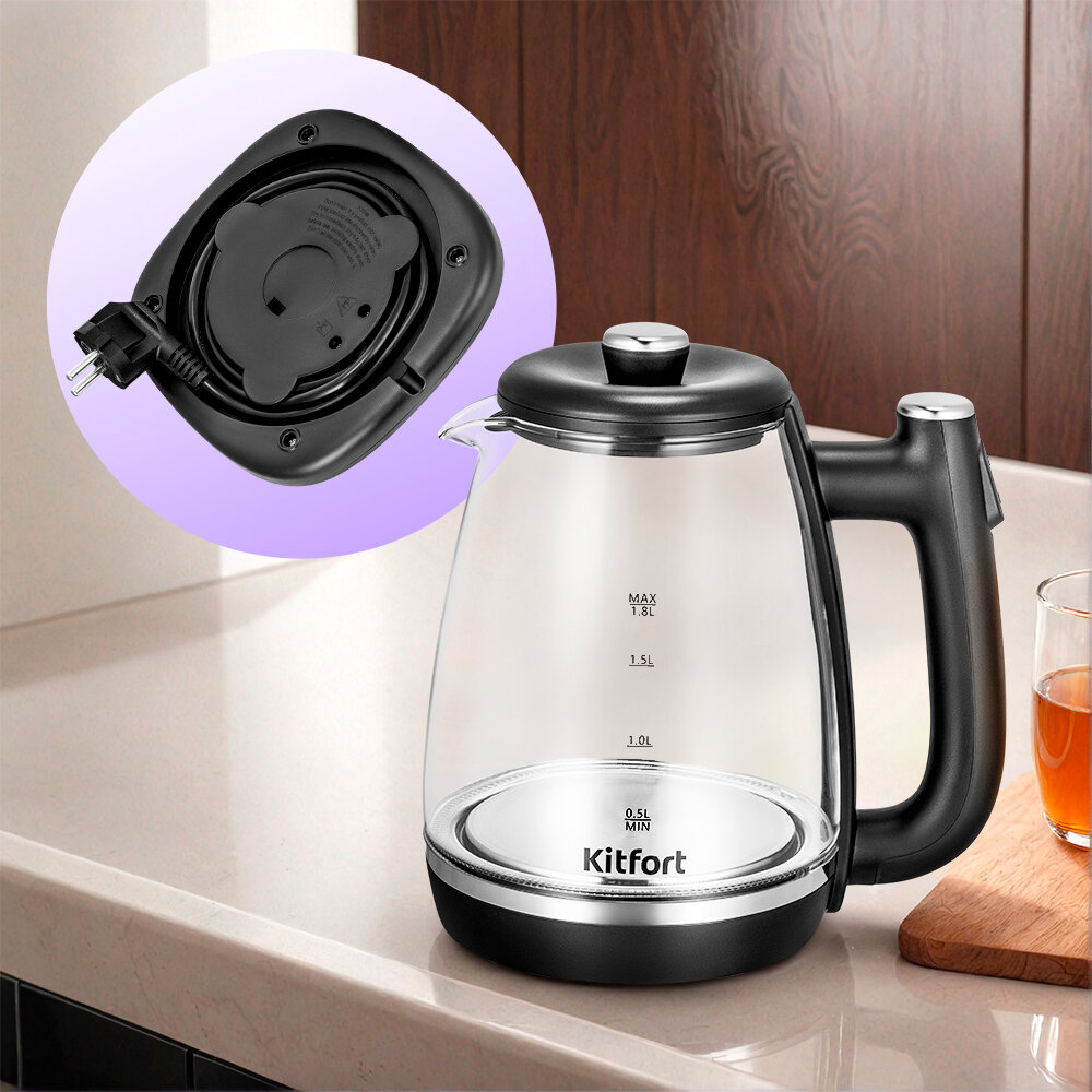 Подставка с центральным контактом дает возможность располагать на ней чайник в любом положении, обеспечивая вращение на 360°. Снизу имеется отсек для хранения шнура, в который можно смотать излишки шнура электропитания, чтобы он не мешал на столе.