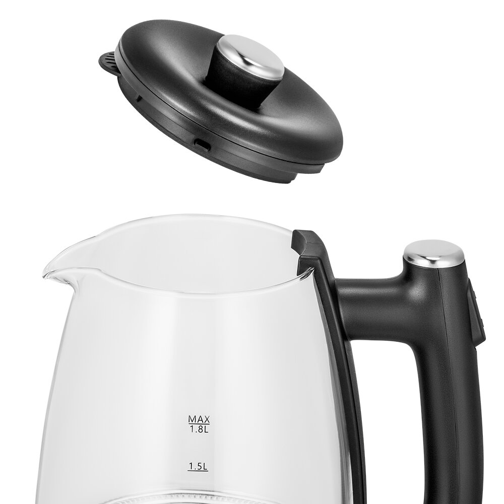 Корпус чайника выполнен из стекла. Ручка чайника сделана из пластика, она не нагревается и удобно лежит в руке. Кнопка включения расположена на ручке сверху. Крышка удобно снимается для мытья и налива воды.
