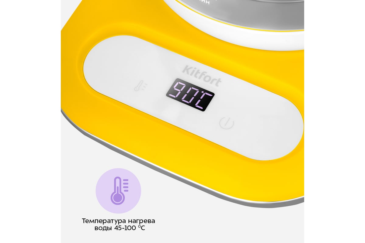 Электрический чайник КТ-6755 может не только вскипятить воду, но и нагреть её до температуры 45, 60, 70, 80 или 90 °С, что очень удобно при заваривании различных сортов чая и кофе, а также при приготовлении детского питания.
