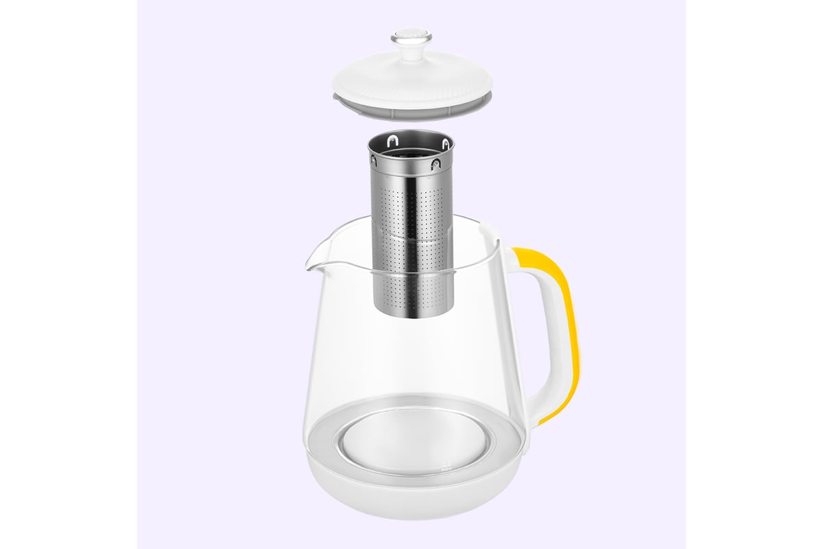 Корпус чайника выполнен из стекла и пластика. Мерная шкала нанесена на стеклянную часть корпуса. Пластиковая ручка чайника позволяет удобно держать его в руке: ручка не скользит и не нагревается благодаря особенностям конструкции.