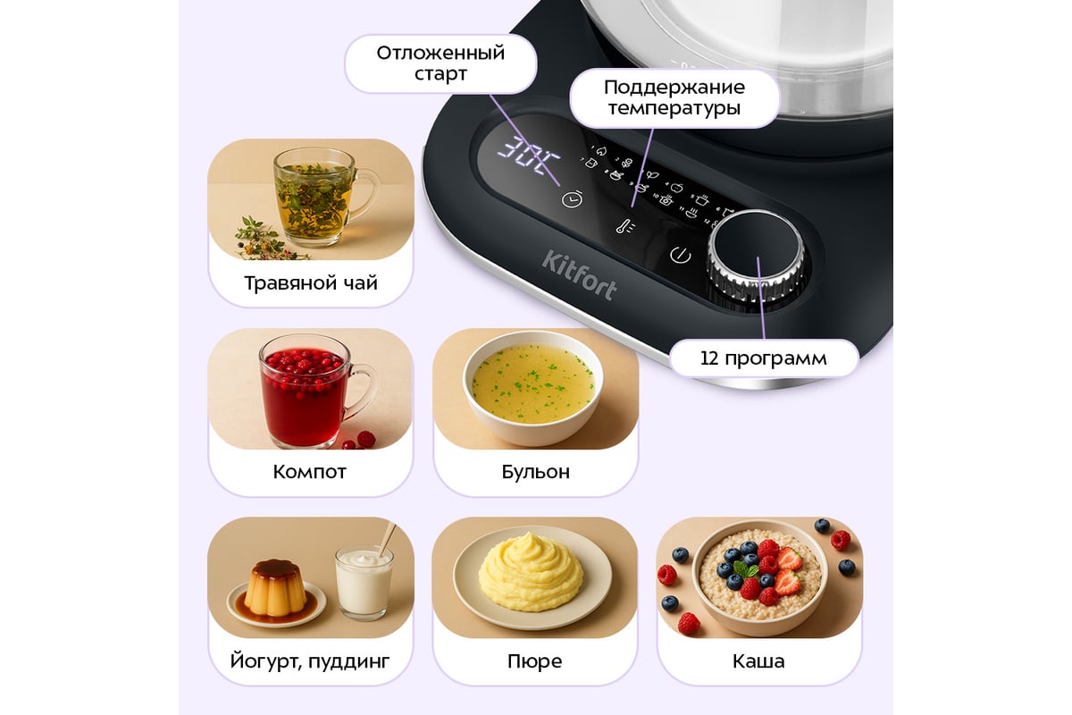 В чайнике 12 программ, которые удобно применять для заваривания разных сортов чая, приготовления йогурта или пудинга, варки супов, бульонов, каш, гарниров и т.д. Они отличаются мощностью и временем нагрева, что дает возможность выбрать оптимальный вариант