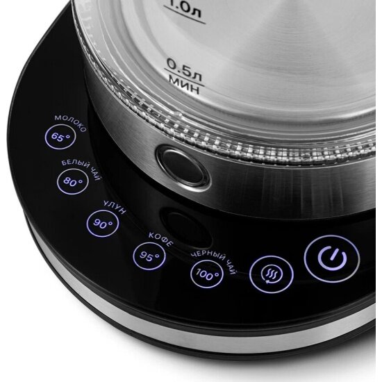 На подставке расположена панель управления чайником. Чайник оснащён функцией поддержания температуры. Температура воды контролируется встроенным в дно чайника термодатчиком.