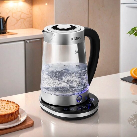 Электрический чайник с электронным терморегулятором Kitfort КТ-6764 может не только вскипятить воду, но и нагреть ее до температур: 65, 80, 90, 95 и 100 °С, что очень удобно при заваривании различных сортов чая и приготовления детского питания.