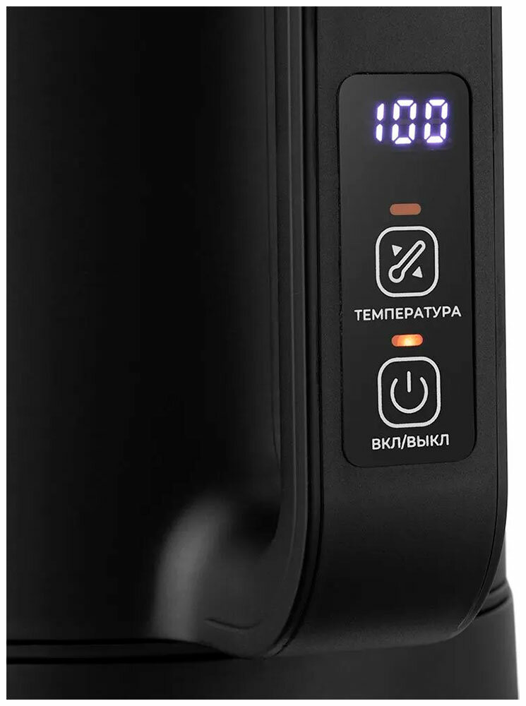 Кнопка «Вкл/Выкл» включает и выключает нагрев. На дисплее отображается текущая температура воды в чайнике. Прибор также может поддерживать заданную температуру в течение 90 минут. Температура воды контролируется встроенным в дно чайника термодатчиком.