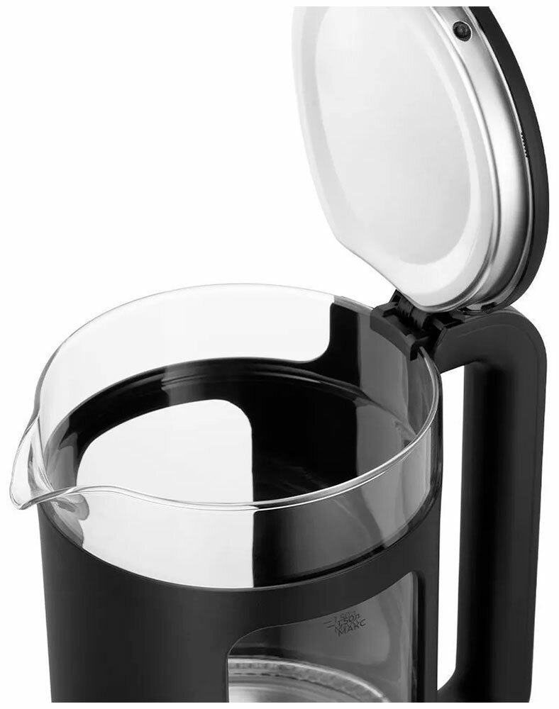 Корпус чайника выполнен из стекла и пластика, а крышка — из нержавеющей стали и пластика. Мерная шкала нанесена на стеклянную часть корпуса. Ручка пластиковая, она не нагревается и удобно лежит в руке.