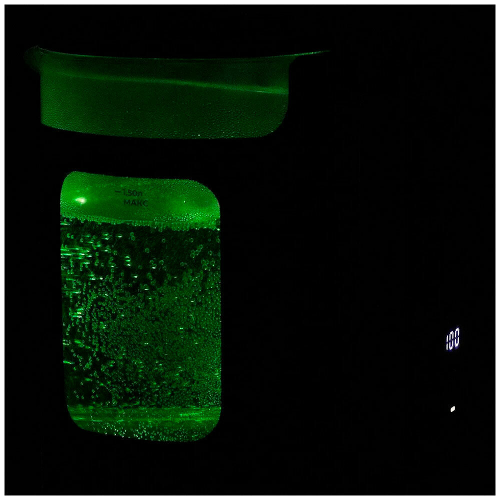 При включении чайника загорается подсветка, которая является индикатором работы и подсвечивает воду в приборе. Подсветка горит пятью разными цветами в зависимости от температуры воды.