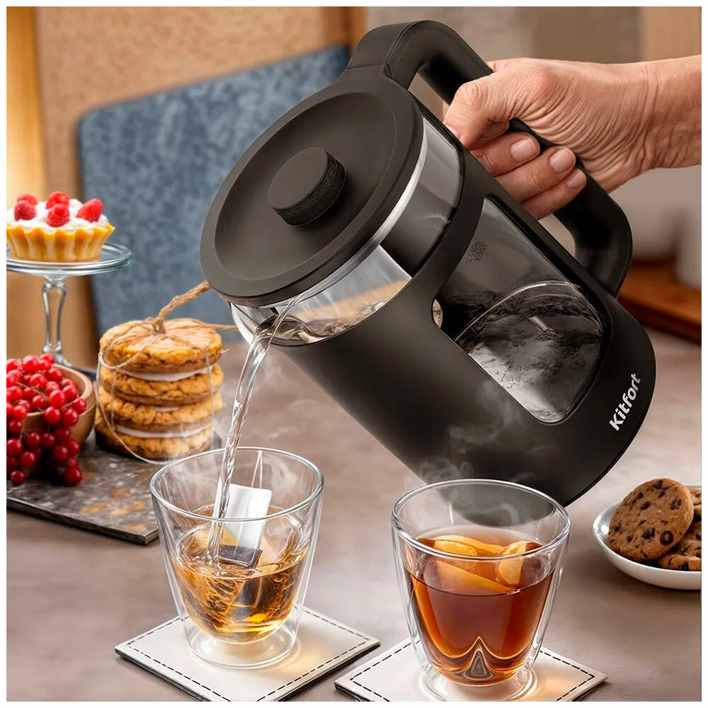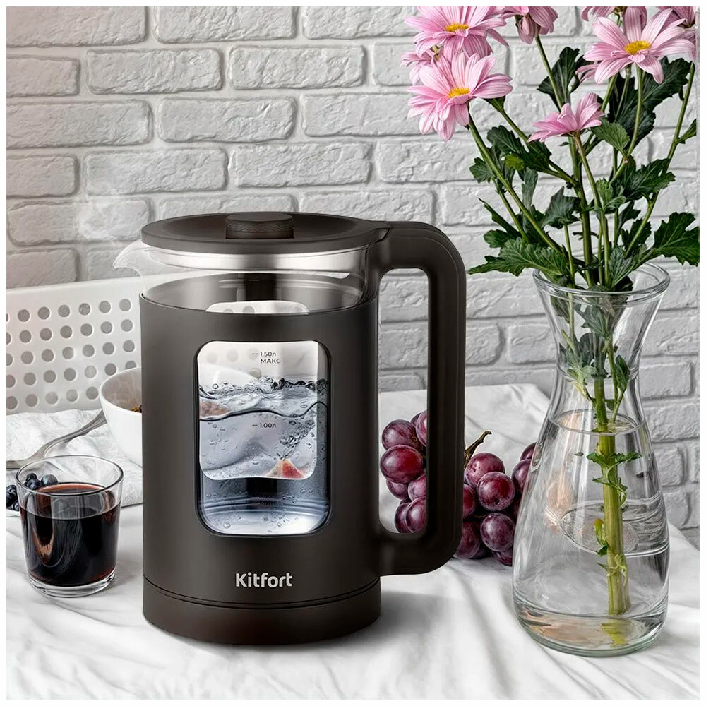 Электрический чайник КТ-6782 предназначен для кипячения воды дома, в офисе, на даче. Прибор также может нагреть воду до температуры 55, 65, 75, 85, 95 и 100 °С, что удобно при заваривании различных сортов чая. Ёмкость чайника 1,5 л.