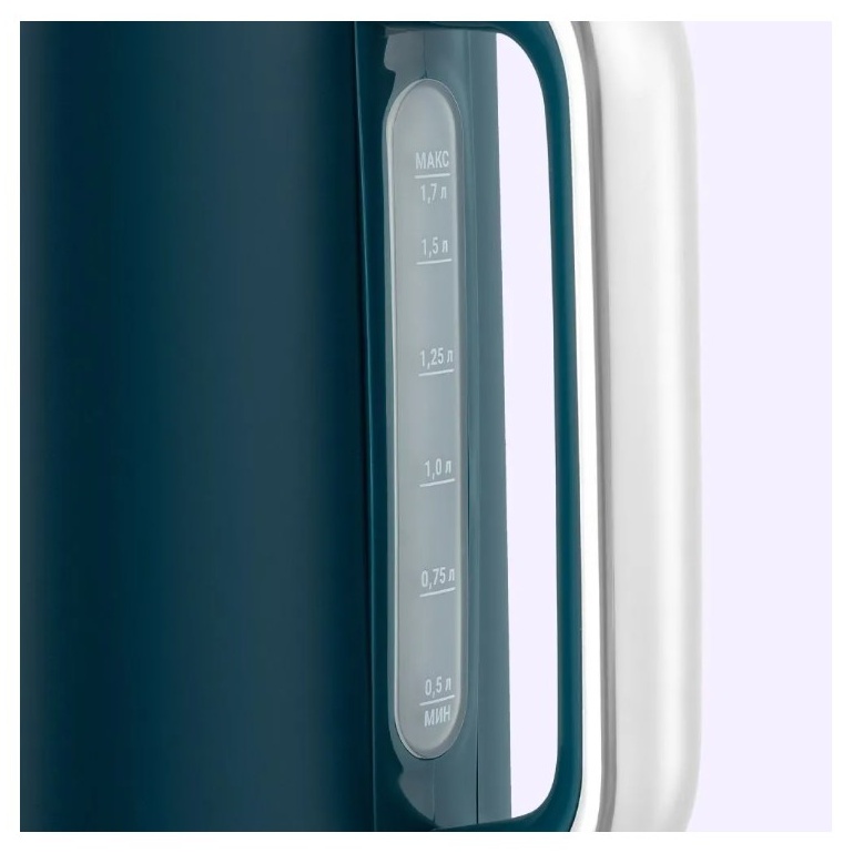 Пластиковая ручка чайника не нагревается и удобно лежит в руке. На прозрачной части корпуса под ручкой расположена мерная шкала с отметками минимального и максимального уровня воды для удобного контроля наполнения.