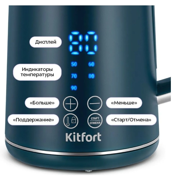 Кнопками «Больше/Меньше» регулируется температура от 50 до 100℃ с шагом 10℃ — удобно для заваривания чая и приготовления детского питания. Кнопка «Старт/Отмена» включает и отключает нагрев и поддержание температуры.