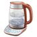 Корпус чайника выполнен из сочетания стекла, нержавеющей стали и пластика. Ручка выполнена из пластика и на ней расположена кнопка открытия крышки чайника. При включении чайника загорается подсветка.