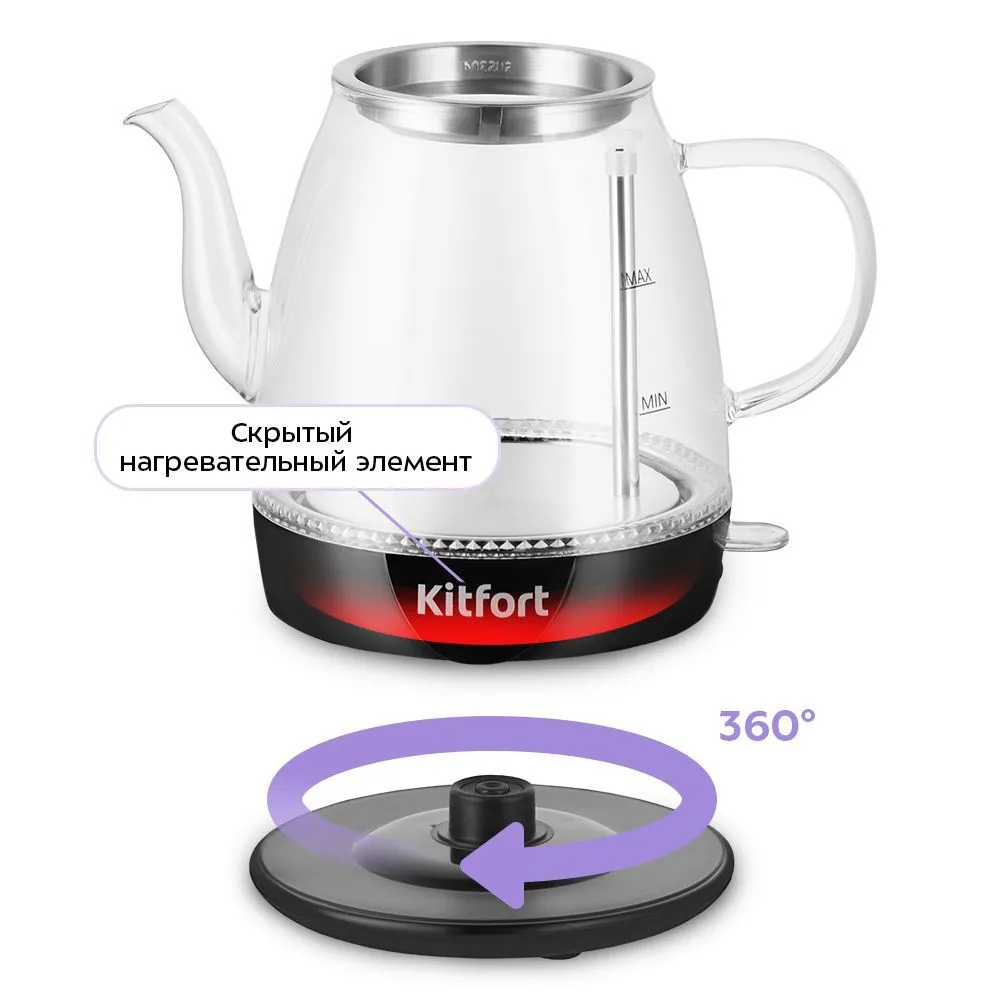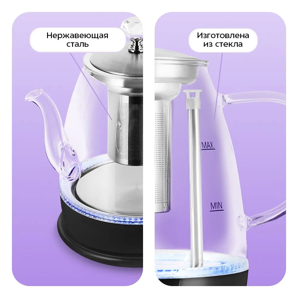 В чайнике КТ-6795 есть встроенный фильтр для заваривания чая. Вам нужно только засыпать чайные листья в фильтр и залить воду. Чайник автоматически отключается при закипании, имеет защиту от перегрева и от включения без воды