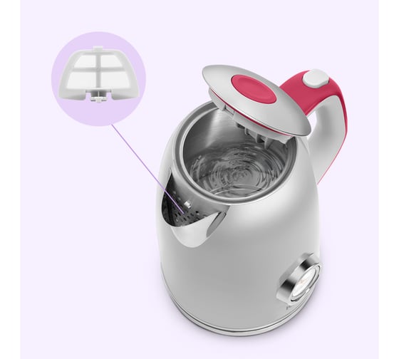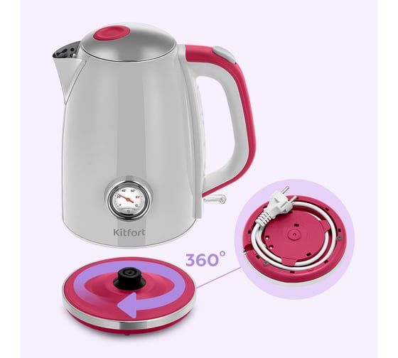 Подставка с центральным контактом даёт возможность располагать на ней чайник в любом положении, обеспечивая вращение на 360°. Чайник автоматически отключается при закипании, имеет защиту от перегрева и от включения без воды.