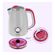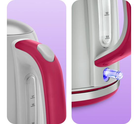 Кнопка открывания крышки расположена на крышке, а кнопка включения — под ручкой. При включении чайника загорается подсветка кнопки включения, которая является индикатором работы.