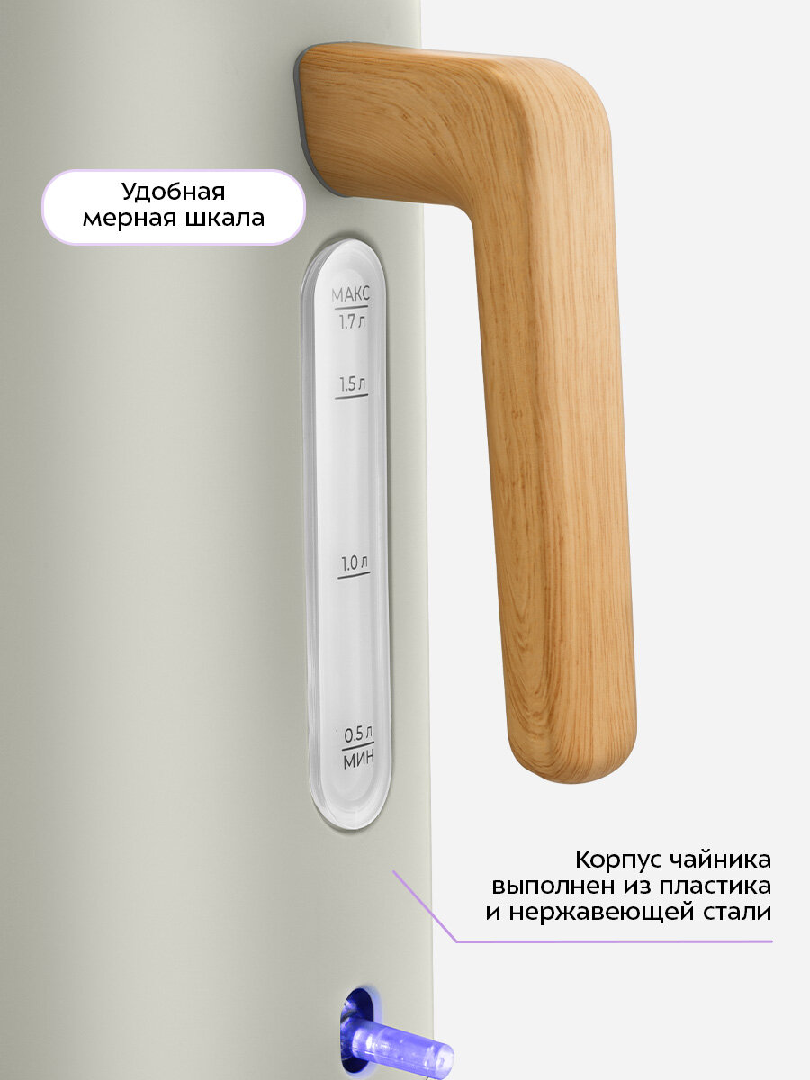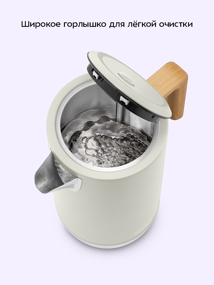 Чайник продуман до мелочей: широкое горлышко обеспечивает лёгкую и быструю очистку, а кнопка открытия, расположенная прямо на крышке, делает использование максимально простым.
