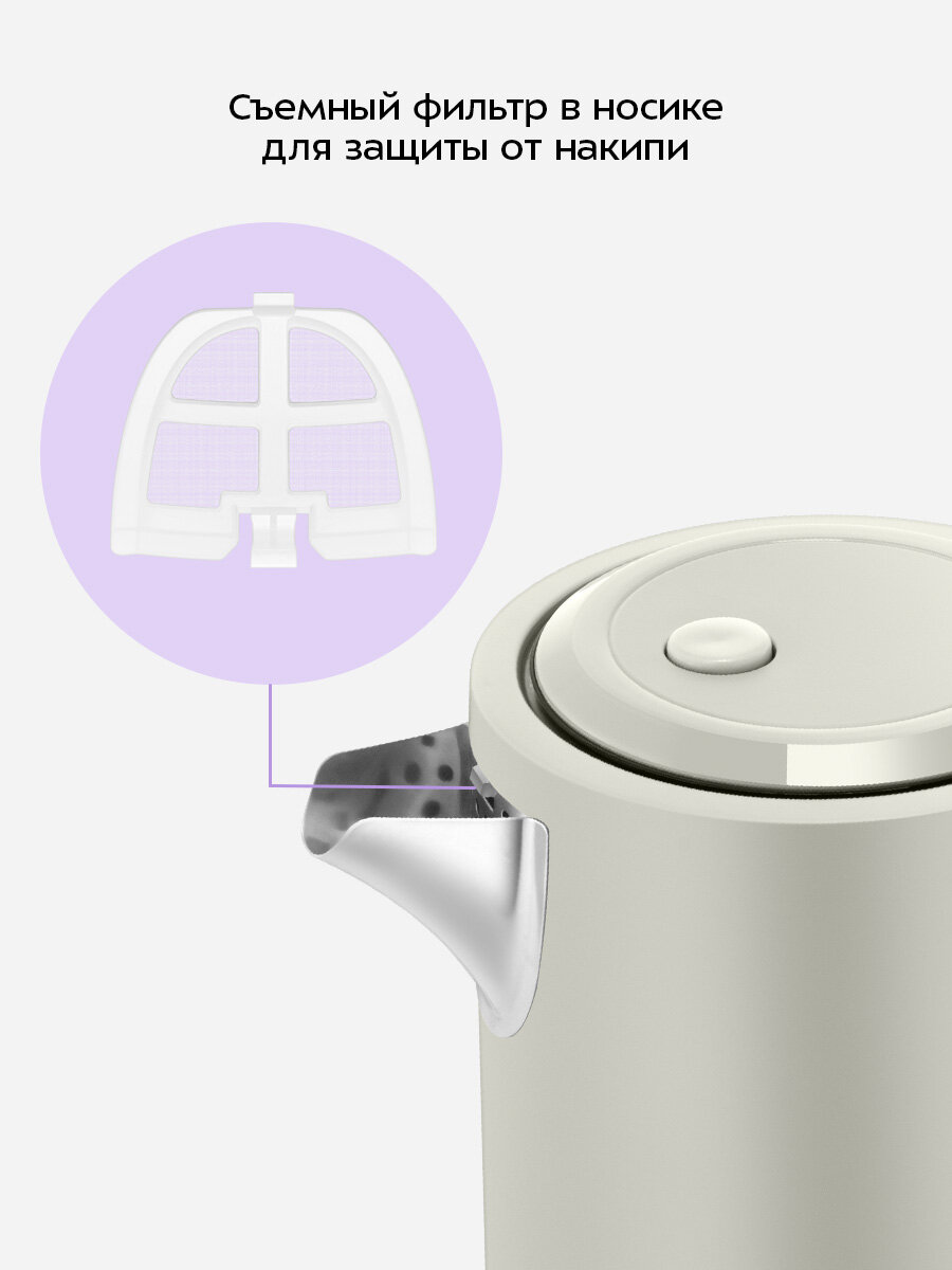 Специальная форма носика позволяет точно наливать воду в чашку без расплёскивания и брызг и быстро наполнять её. В носике чайника расположен съёмный фильтр от накипи, который задерживает частички накипи и предотвращает их попадание в чашку.
