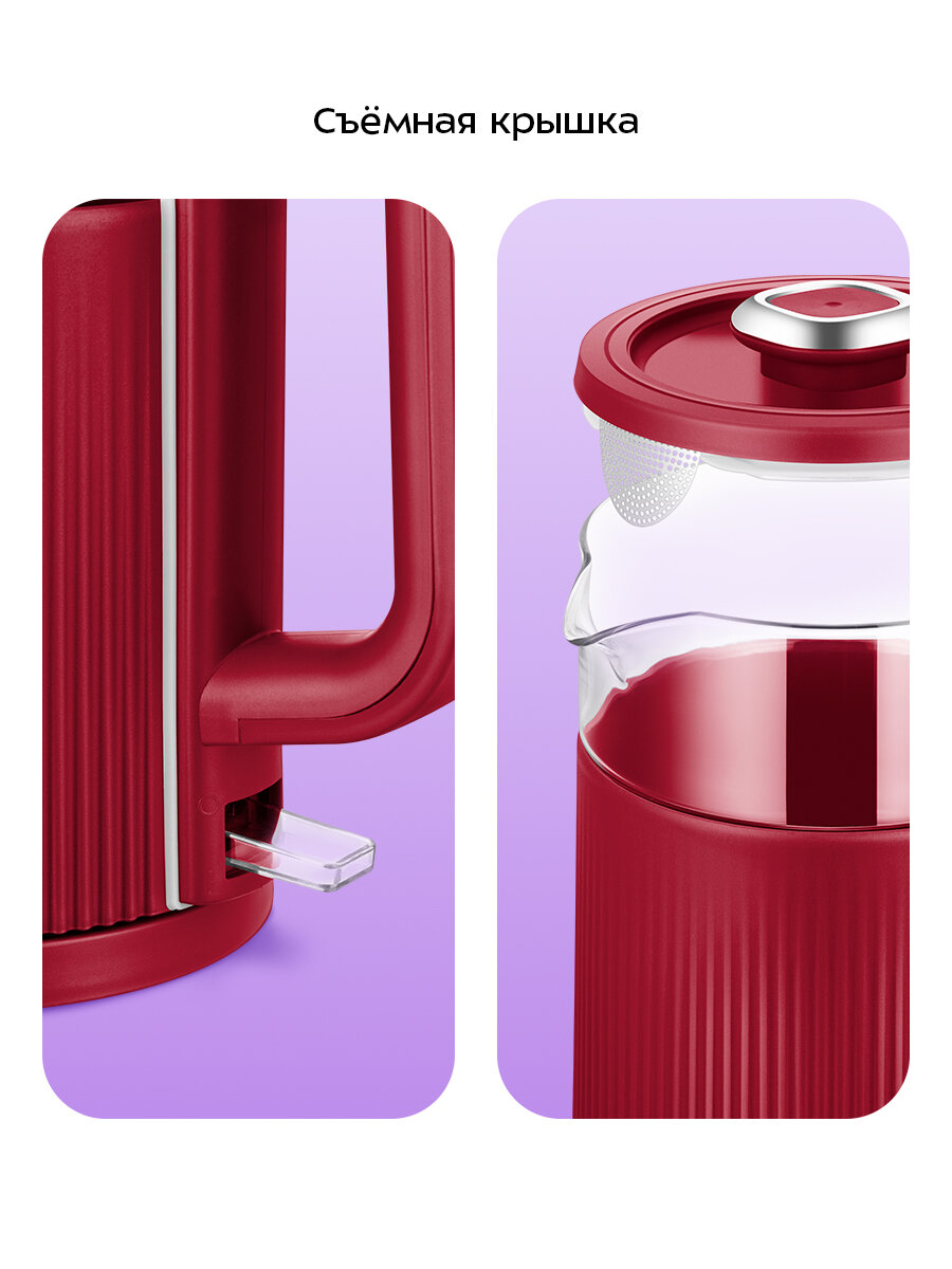 Крышка у чайника съёмная. Переключатель находится под ручкой. При включении чайника загорается подсветка на корпусе чайника. Она является индикатором работы.
