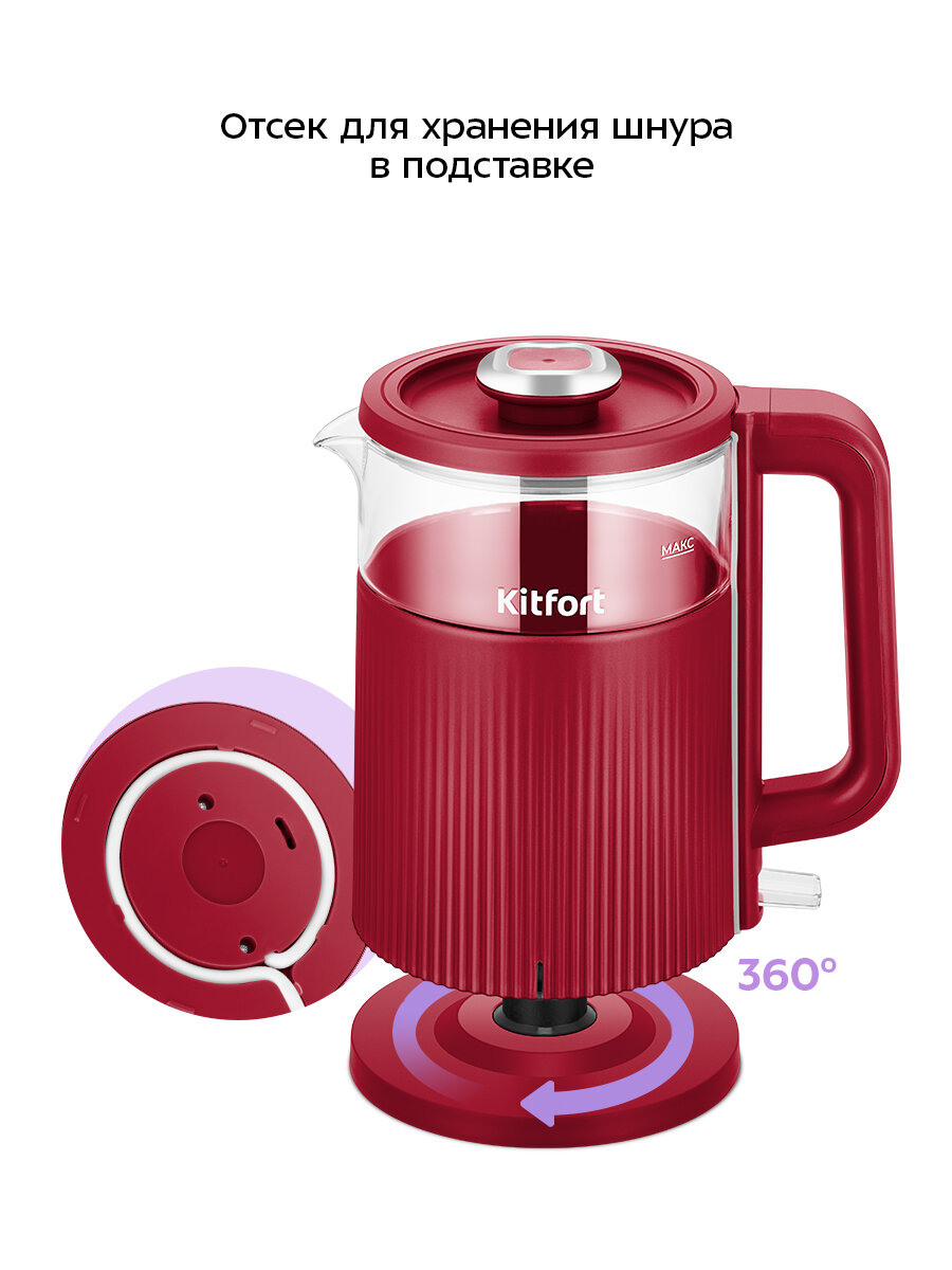 Подставка с центральным контактом даёт возможность располагать на ней чайник в любом положении, обеспечивая вращение на 360°. Снизу имеется отсек для хранения шнура, в который можно смотать излишки шнура электропитания, чтобы он не мешал на столе.