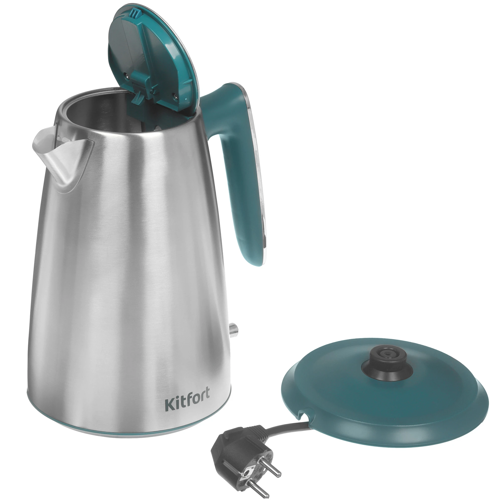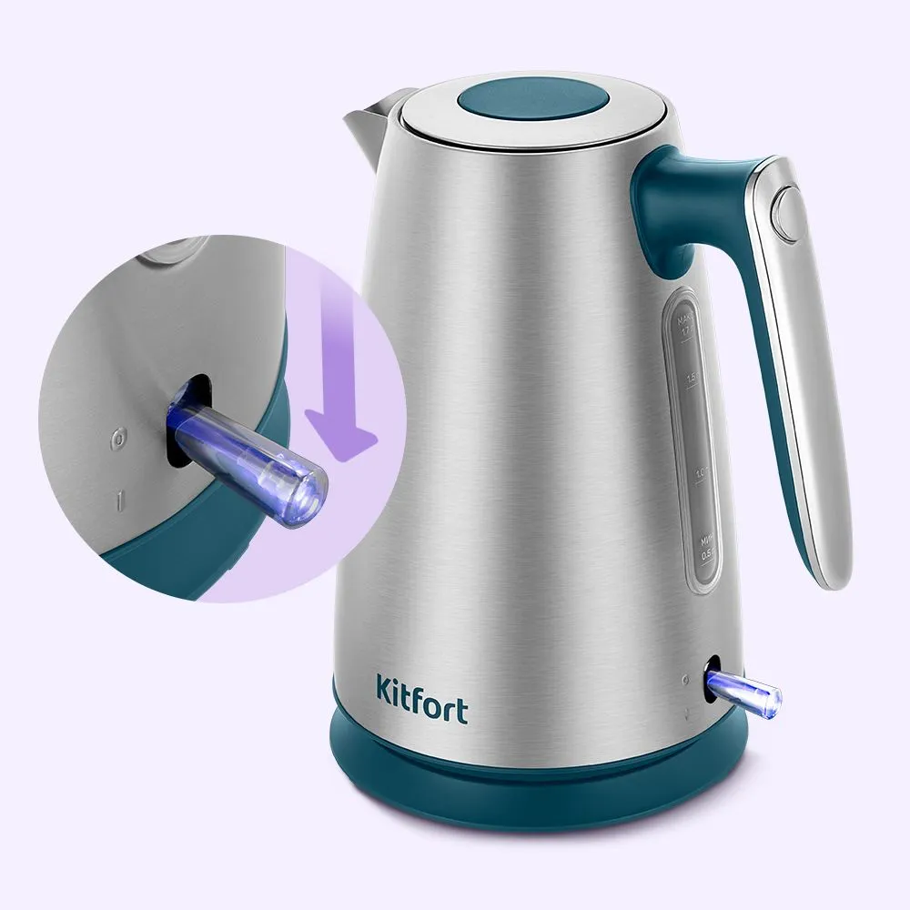 Электрический чайник КТ-8725 предназначен для кипячения воды дома, в офисе, на даче. Корпус чайника выполнен из нержавеющей стали, а крышка — из сочетания нержавеющей стали и пластика. Мерная шкала находится под ручкой чайника.