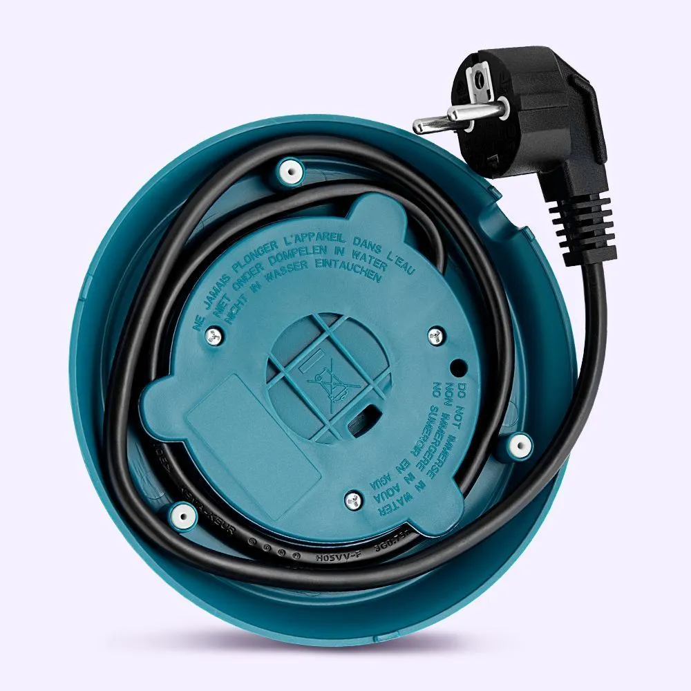 Подставка с центральным контактом дает возможность располагать на ней чайник в любом положении, обеспечивая вращение на 360°. Снизу имеется отсек для хранения шнура, в который можно смотать излишки шнура электропитания, чтобы он не мешал на столе.