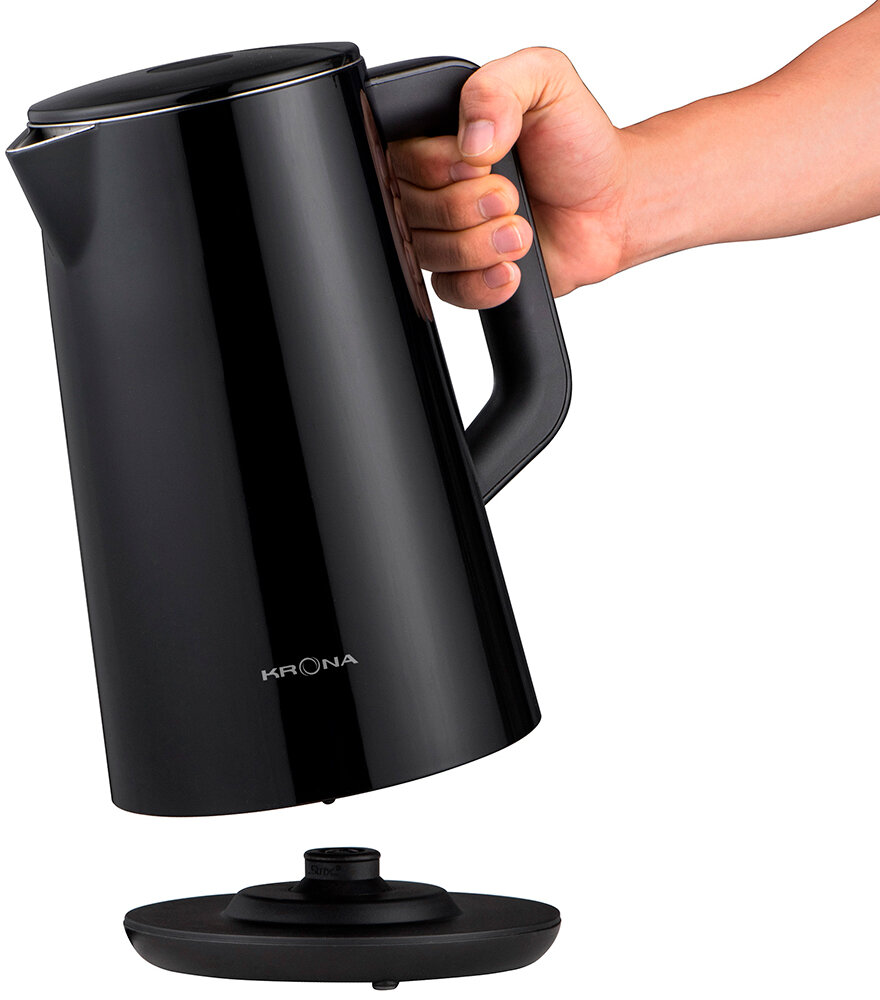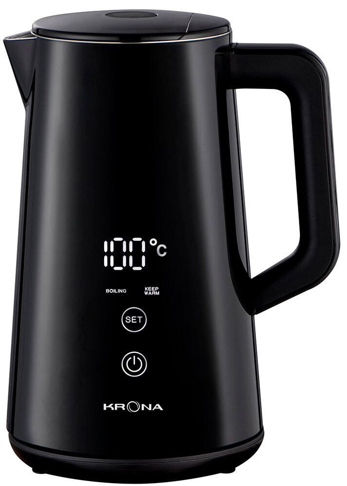 KRONA Digitaler Black - этот стильный и современный электрочайник сочетает в себе все преимущества инновационных технологий и надежной функциональности. Цифровое сенсорное управление предоставляет полный контроль над процессом нагрева. LED дисплей вровень с корпусом информирует о текущей температуре воды, а двойные стенки корпуса сохраняют тепло дольше. Емкость 1,5 литра идеально подходит для домашнего использования. Чайник оснащен гибкой регулировкой температурного режима от 40°C до 100°C, что позволяет выбрать оптимальный режим нагрева для различных напитков. Тройная защита предотвращает сухое кипячение, чайник отключается при снятии и автоматически выключается при закипании. Встроенный фильтр защиты от пыли и накипи, сохраняет воду чистой