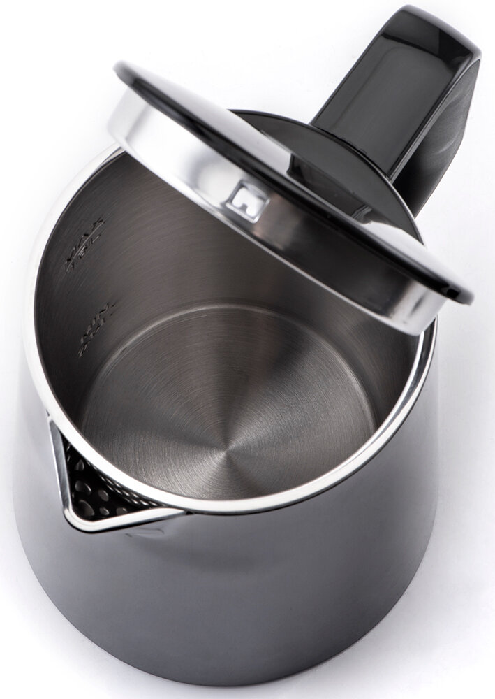 Внешняя поверхность чайника изготовлена из высококачественного черного пластика, что позволяет избежать случайного ожога. Внутренняя поверхность полностью металлическая, выполненная из нержавеющей стали устойчива к окислению и коррозии.