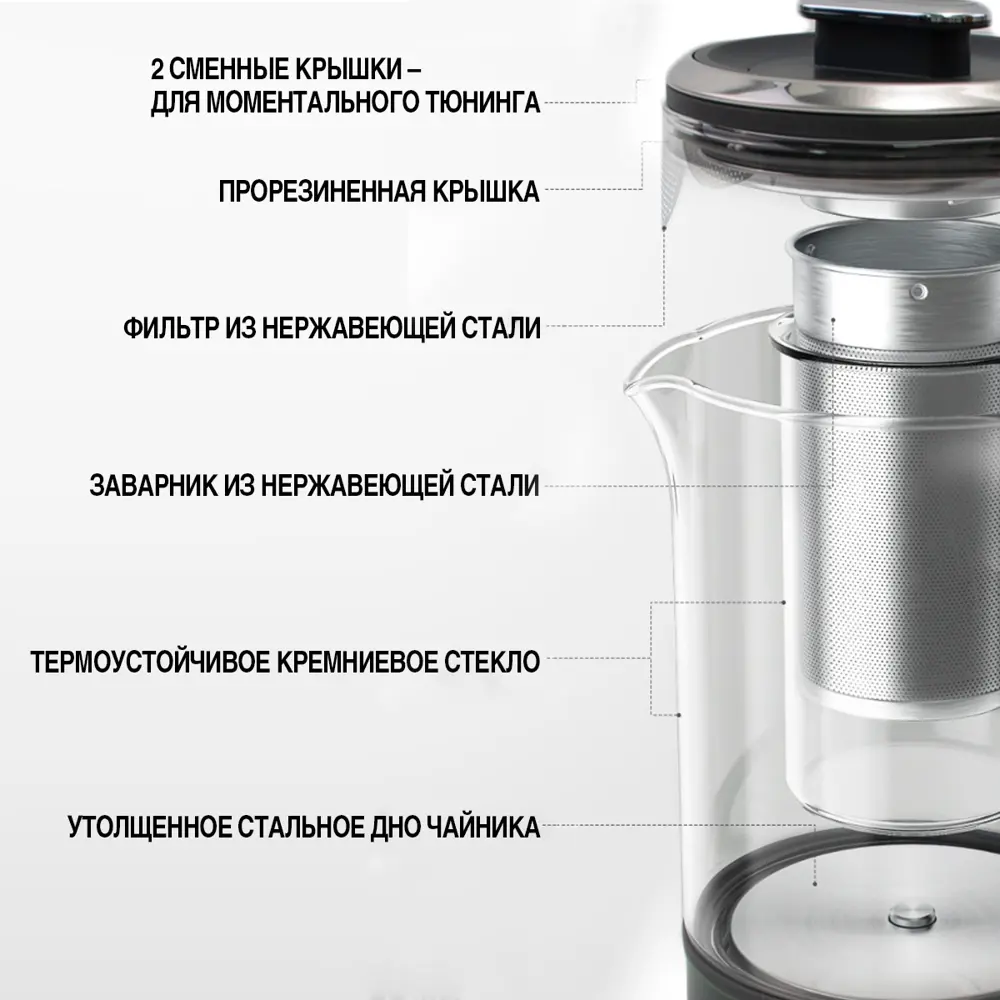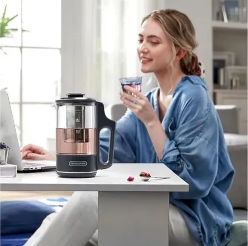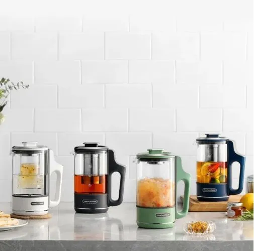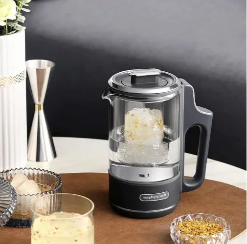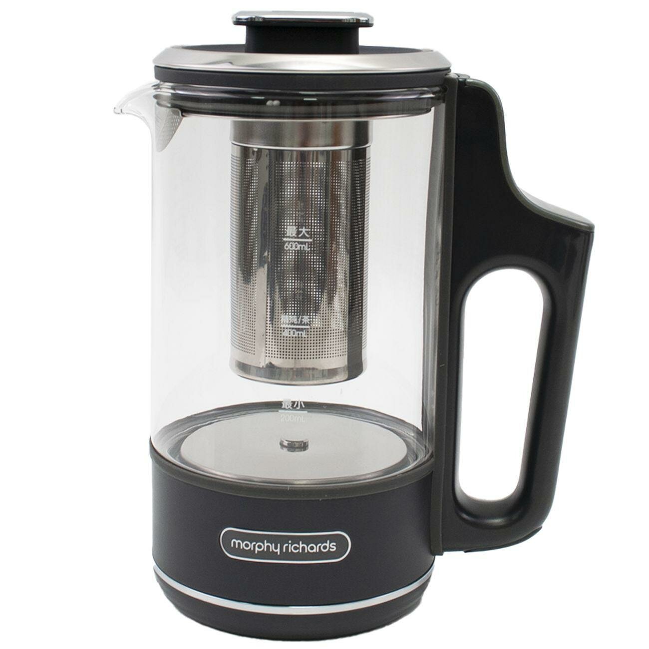 Электрочайник Morphy Richards MR6086G выполнен в сером пластиковом корпусе и оснащен тремя режимами нагрева воды: 45°С, 80°С и 100°. Есть возможность поддержания температуры воды на 15 минут, 45 минут и 90 минут. Колба для жидкости сделана из термостойкого кремниевого стекла, есть стальной заварник и фильтр в носике от накипи. Длина кабеля питания — 1,2 м, объем чайника — 600 мл. В комплекте есть две сменные крышки — одна с заварником, вторая превращает чайник в графин. Размеры чайника — 210х100х170 мм.