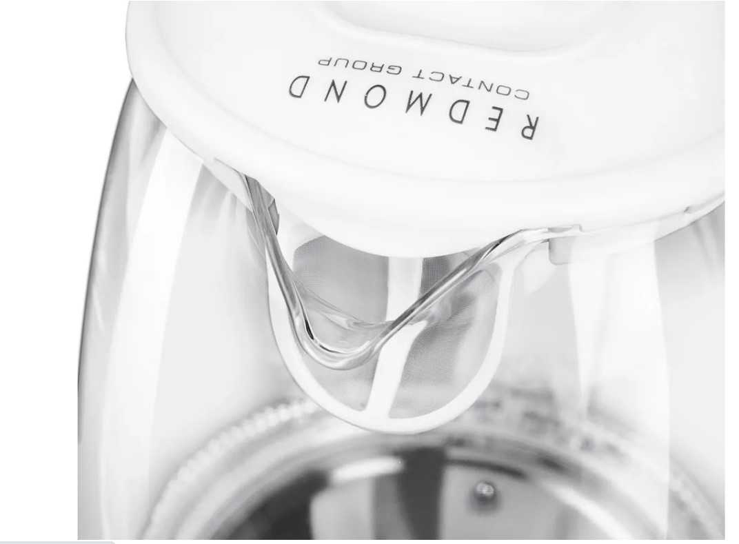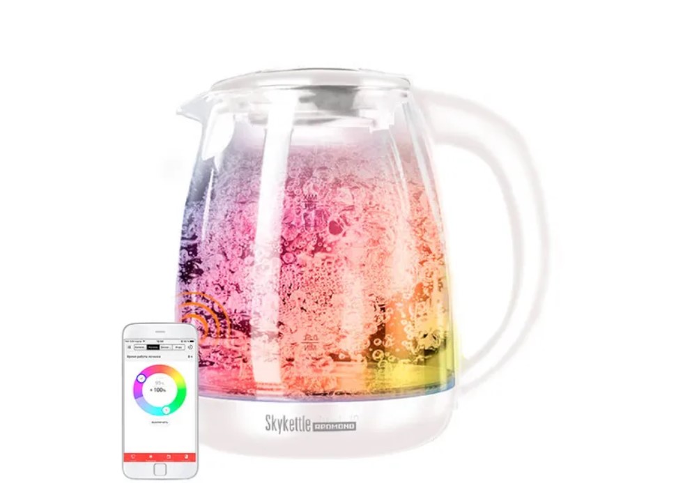 Чайник REDMOND SkyKettle оснащен светодиодной подсветкой. С мобильного устройства можно выбрать цвет и яркость подсвечивания колбы, установить время смены оттенков в интервале от 30 сек. до 3 мин. Также вы можете устанавливать цвет в зависимости от температуры воды в колбе,