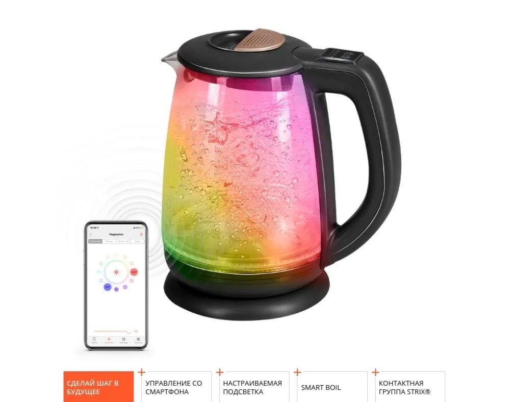 Умный чайник не выйдет из строя из-за перегрева. Система безопасности автоматически отключит прибор, если в колбе нет воды, а также при закипании воды и снятии устройства с подставки в процессе работы.