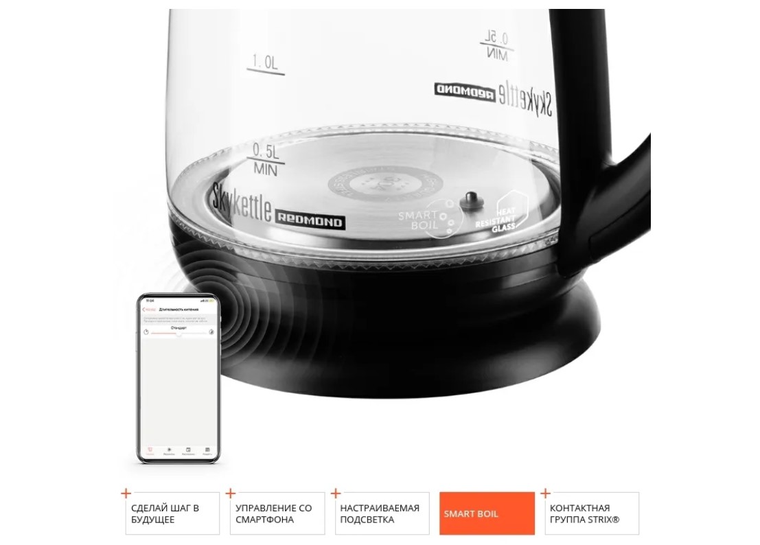 REDMOND SkyKettle RK-G233S – это современный умный чайник с настраиваемой подсветкой и дистанционным управлением со смартфона. Стоит сделать 1 клик на экране смартфона, и SkyKettle нагреет воду до нужной температуры и сможет поддерживать ее теплой до 12 часов.