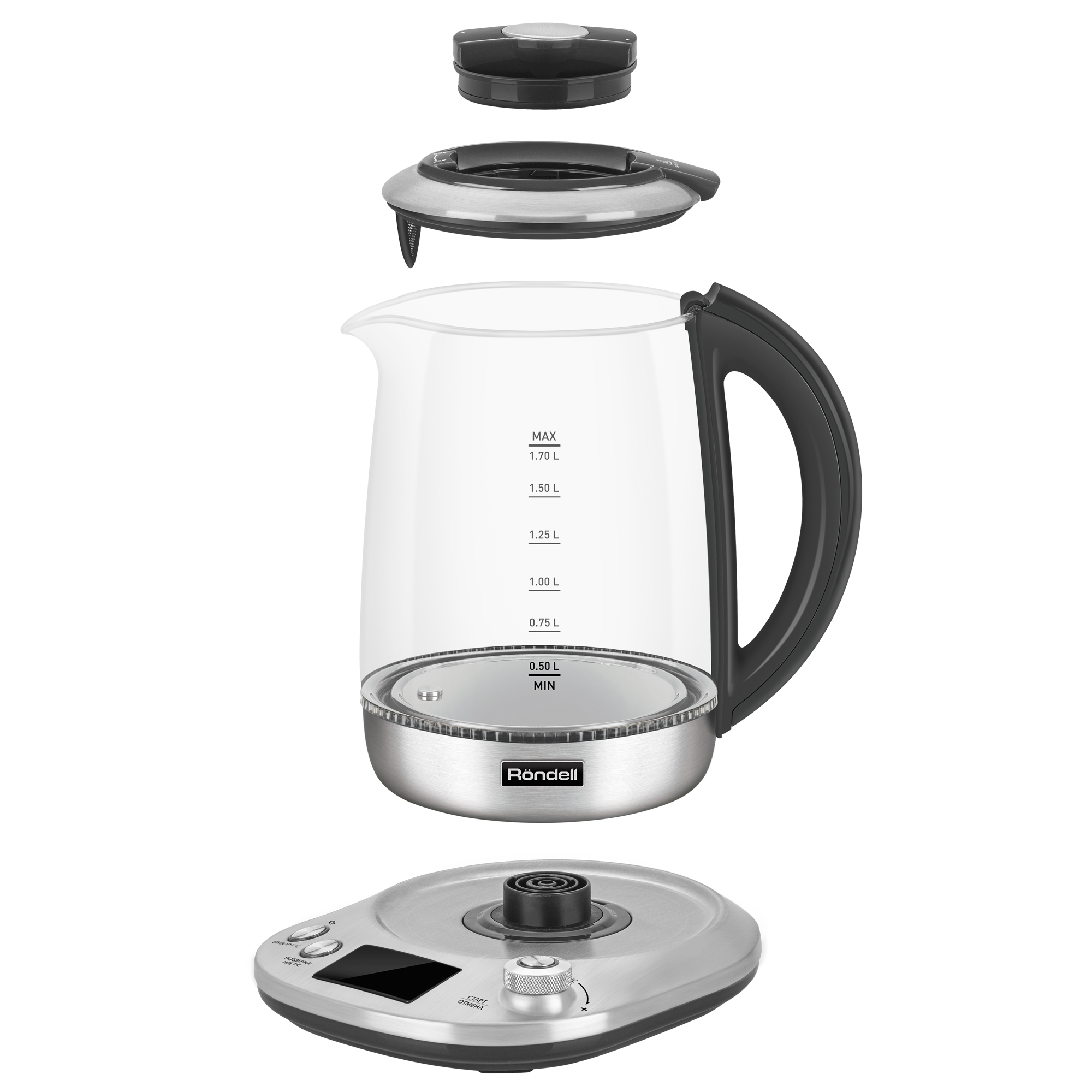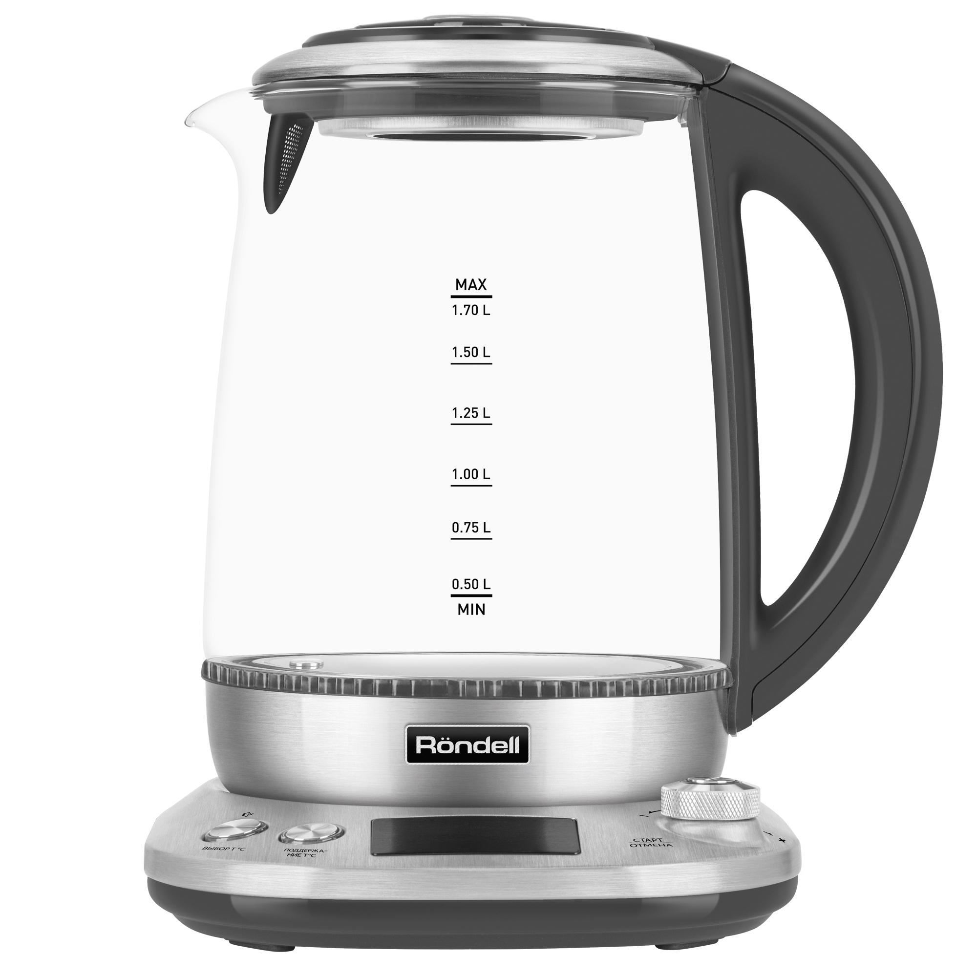 Многофункциональность и современный дизайн электрического чайника RDE-1003 оценят даже самые взыскательные покупатели. Благодаря максимальной мощности в 2200 Вт он вскипятит до 1,7 л воды за считаные минуты. Прибор имеет электронную базу с большим LCD-дисплеем, с помощью которого вы сможете выбрать один из шести автоматических режимов для приготовления напитков или отрегулировать температуру воды от 40° до 100° с шагом в 1°. Корпус чайника выполнен из термостойкого стекла и декорирован стильными элементами из нержавеющей стали. Красивая подсветка делает использование устройства особенно приятным. Благодаря продуманной конструкции чайник поворачивается на 360° при установке на базу. Следить за уровнем воды помогает специальная шкала, нанесенная на стенку стеклянного корпуса. Чайник оснащен сертифицированным английским контроллером STRIX, который гарантирует 15 000 циклов кипячения и продлевает срок службы устройства в 5 раз. В приборе продумана каждая деталь! Например, наливать воду в чайник можно через специальное открывающееся отверстие в крышке. При желании крышку прибора можно снять полностью. Устройство также имеет несколько особенных функций: поддержания температуры на протяжении двух часов, памяти (устройство запоминает и воспроизводит последнюю настройку температуры), а также «спящий режим», когда чайник полностью отключается через 20 минут после последнего включения. В случае необходимости вы можете остановить кипячение или убрать звуковые сигналы при помощи соответствующих кнопок. Фильтр от накипи из нержавеющей стали, расположенный в носике чайника, легко снять и промыть. Чайник оснащен защитой от перегрева и автоматически отключается при закипании или отсутствии в нем воды. Купите чайник RDE-1003 и подарите себе непревзойденный уровень комфорта!
