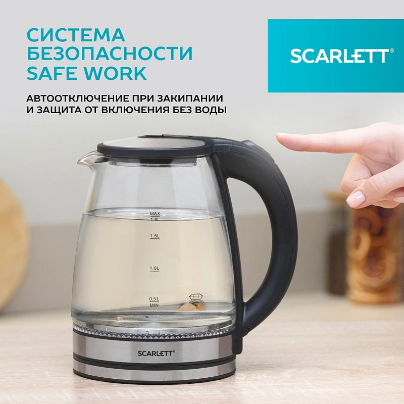 Электрический чайник Scarlett SC-EK27G103 обеспечивает надежное и безопасное использование. Внутренняя подсветка позволяет удобно пользоваться прибором даже при слабом освещении. Объём чайника составляет 1,8 литра. Шнур удобно убирается в специальный отсек в базе прибора. Система безопасности Safe Work – автоматическое отключение при закипании воды, защита от включения при отсутствии воды в чайнике.