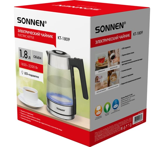 Стильный и надежный чайник SONNEN станет прекрасным дополнением любой кухни. Оригинальный текстурный корпус из термостойкого стекла, приятная синяя подсветка – отличный чайник для атмосферного чаепития!