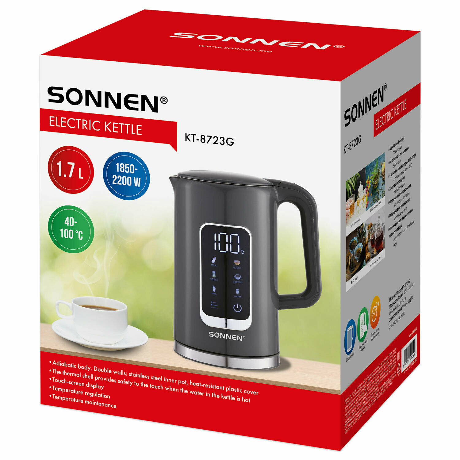Чайник SONNEN KT-8723G станет незаменимым помощником на вашей кухне или в офисе и поможет приготовить большое количество согревающих напитков