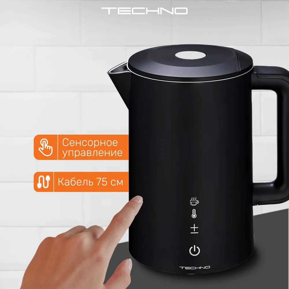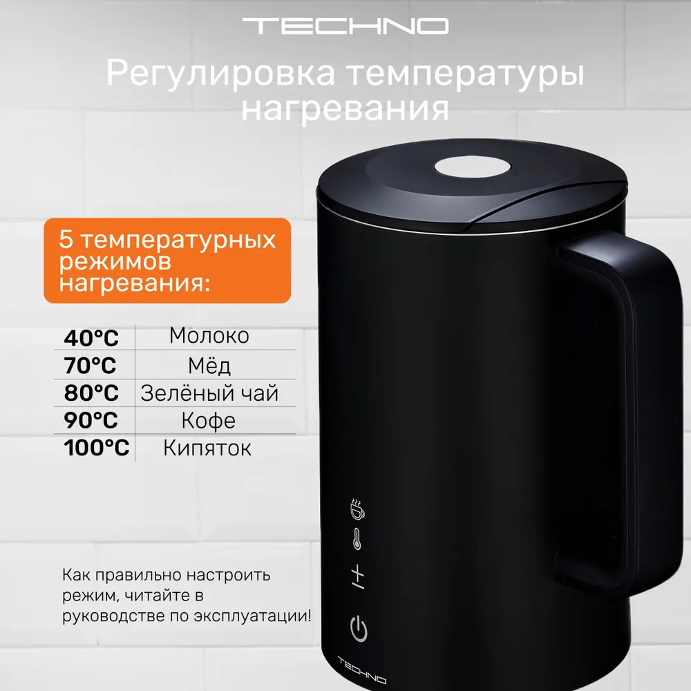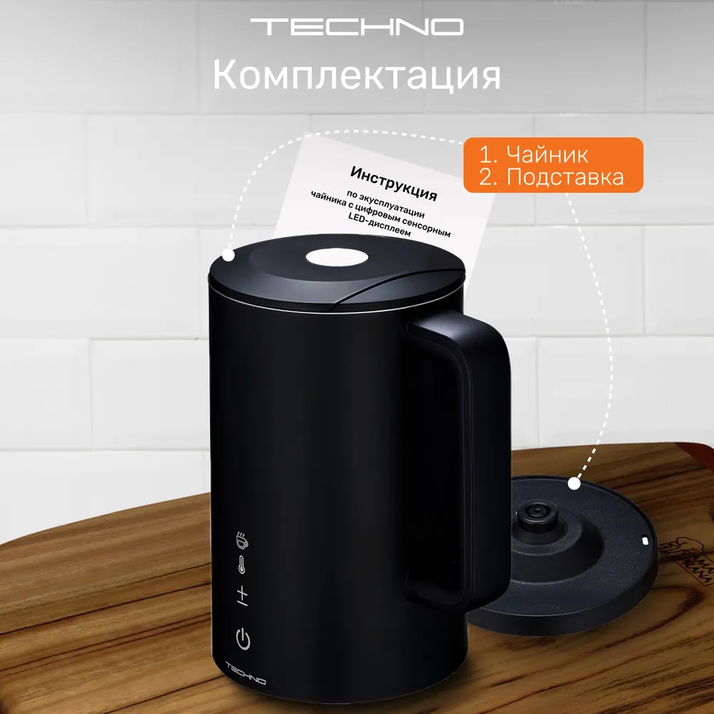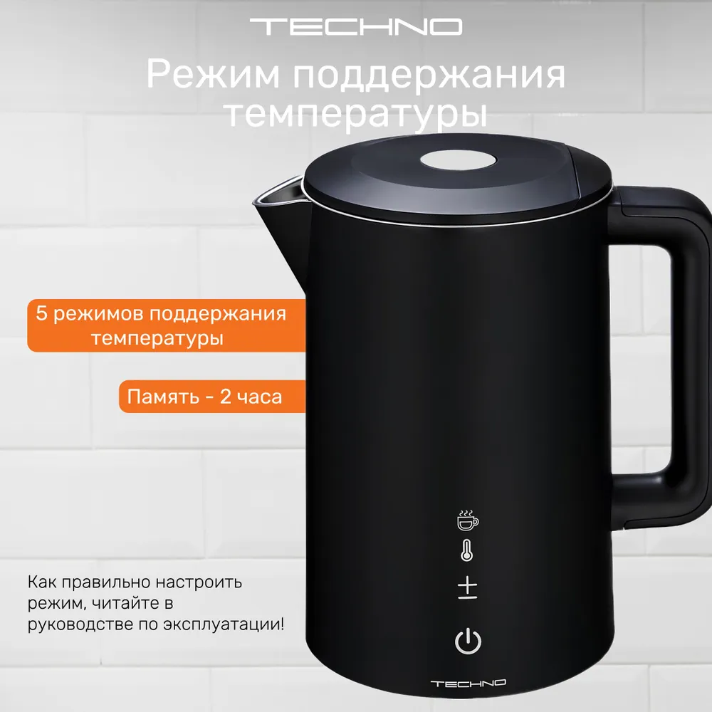 Конструкция чайника: Вращение подставки на 360°, Двухслойный корпус, Дисплей, Противокапельная система, Фильтр от накипи, Бесшумный