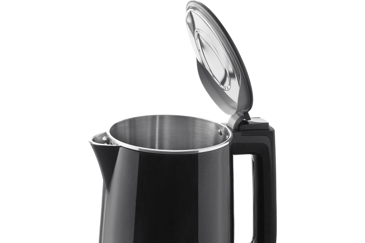 Носик удобной формы защищает от проливания кипятка, в его основании находится съёмный фильтр от накипи. Для удобства кнопка включения в нижней части корпуса имеет световую индикацию. Объём чайника — 1,5 литра. 2200 Вт мощности обеспечивают быстрое закипание воды, благодаря чему существенно экономится время.