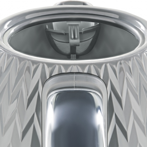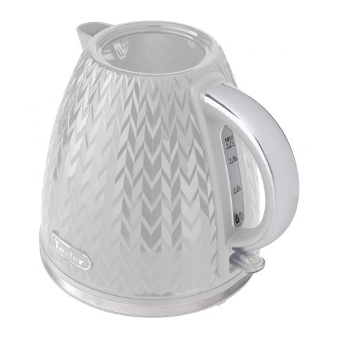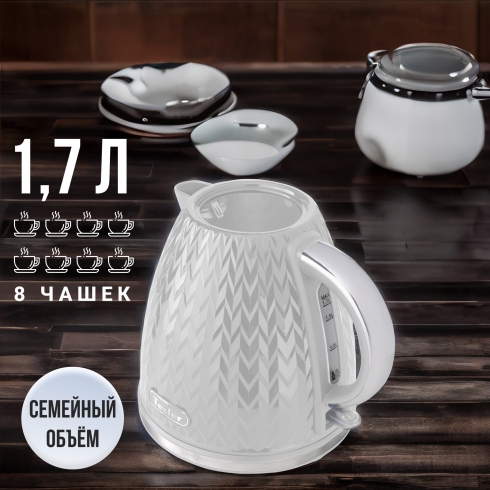 Tesler KT-1704 — стильный электрический чайник с текстурированной поверхностью, дополненной хромированными акцентами.
