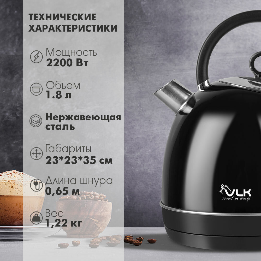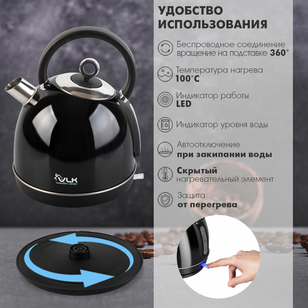 Беспроводное соединение позволяет вращать чайник на подставке на 360 градусов, Корпус из нержавеющей стали, Автоотключение при закипании воды, Шкала уровня воды, Защита от перегрева, Скрытый нагревательный элемент, Фильтр-сетка для защиты от накипи, Отсек для хранения шнура