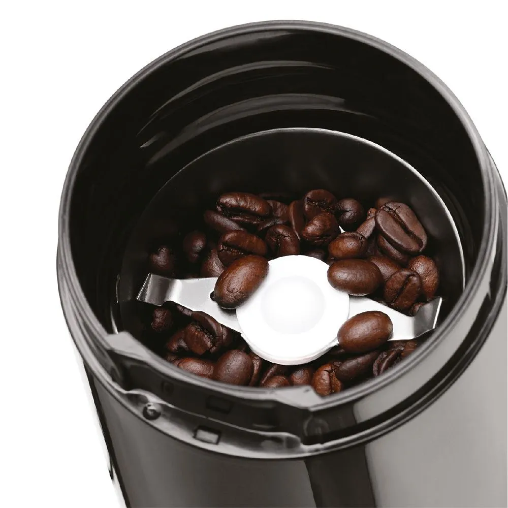 Электрическая кофемолка оснащена стальными ножами из нержавеющей стали, что увеличивает качество помола, предотвращает выделение вредных веществ и увеличивает срок службы. Кофемолка выполнена в специальном эргономичном дизайне, благодаря которому ее удобно держать в руке. Легкая в использовании ручная кофемолка обладает защитной блокировкой от запуска без крышки.