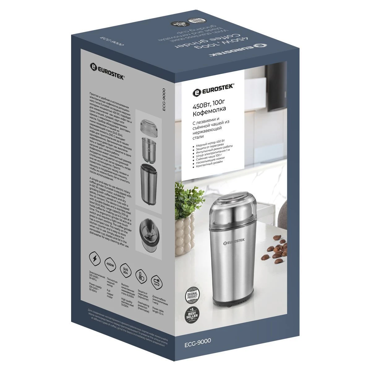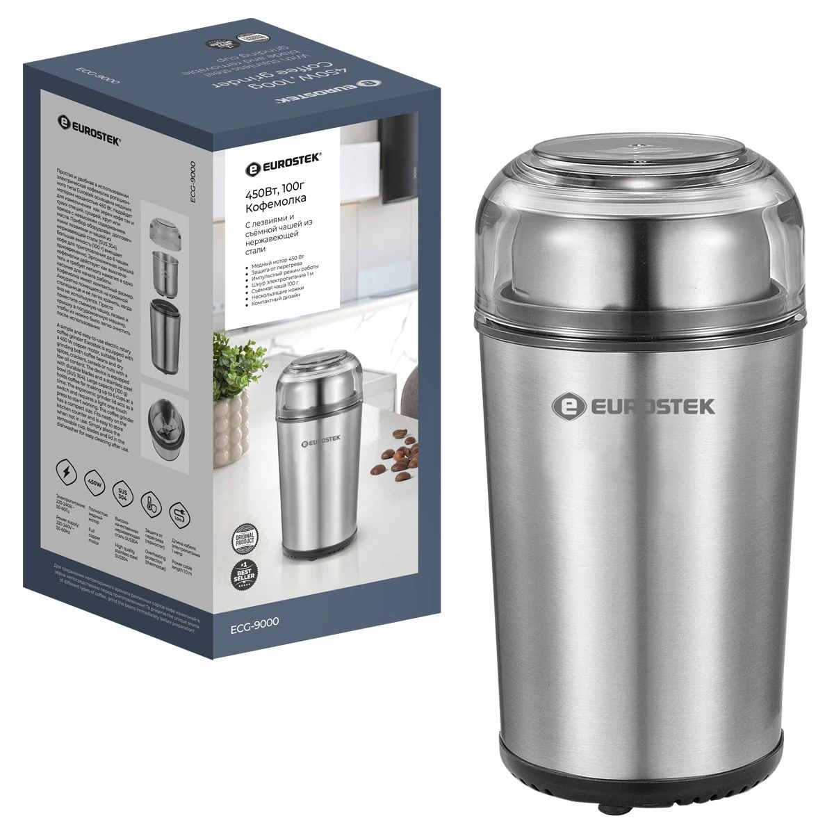 Кофемолка ECG-9000 проста и удобна в использовании. Подойдет для измельчения как зерен кофе так и сухих специй, сухарей, круп. мощность 450 Вт, объем 100 гр.