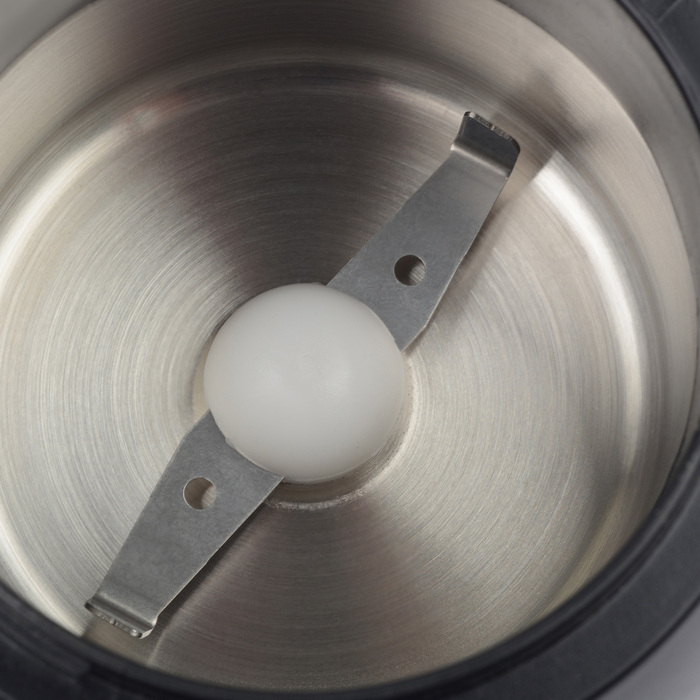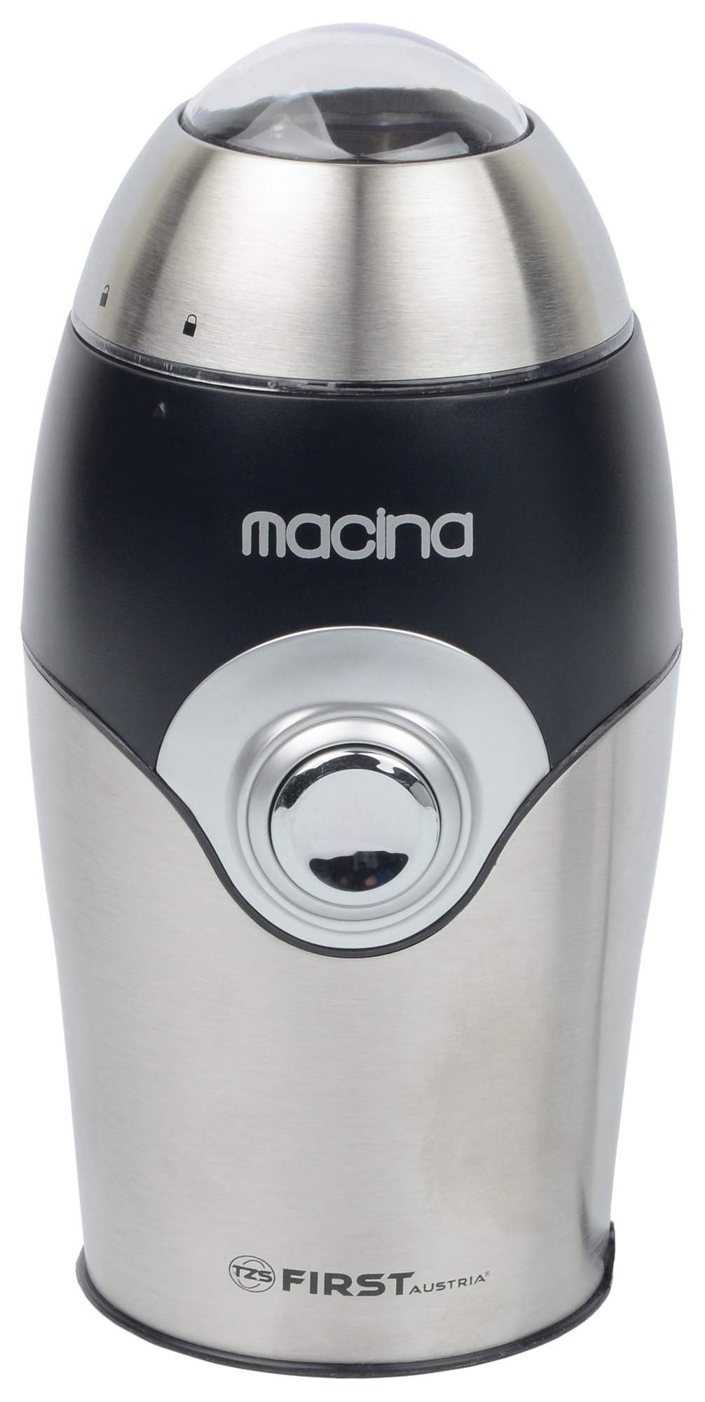 Кофемолка First Macina FA-5485 серебристо-черного цвета – практичный прибор, который имеет не только компактные размеры, но и высокий уровень производительности. Имеет удобную форму и приятную серебристо-черную цветовую гамму. Помол зерен осуществляется при помощи острого ротационного ножа. Аппарат имеет мощный мотор. Материал корпуса – метал. Нож изготовлен из нержавеющей стали. Максимальная загрузка контейнера для зерен – 70 грамм. За одну процедуру помола можно приготовить до 6– 7 чашек вкусного и ароматного кофе