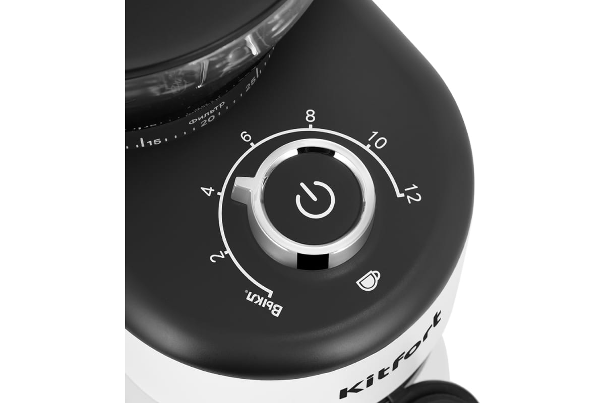 Чтобы выбрать нужное количество чашек, поверните регулятор по часовой стрелке: от 2 до 12. Кофемолка намелет то количество кофе, которые вы установите. Нажатие на кнопку «Вкл/Выкл» запускает помол.