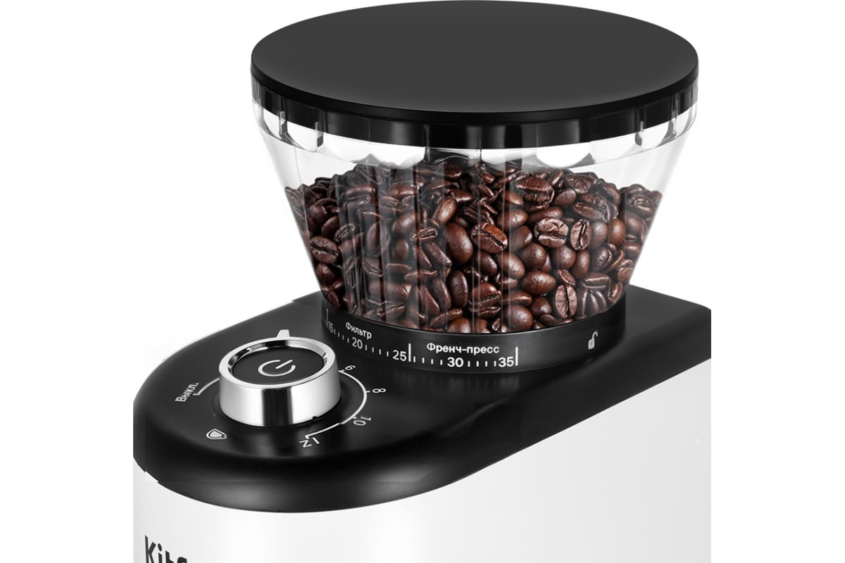 Поворачивая контейнер для зёрен, можно настроить степень помола: от тонкого — для кофеварки эспрессо, до крупного — для френч-пресса. Засечка на регуляторе будет указывать на выбранную степень помола.
