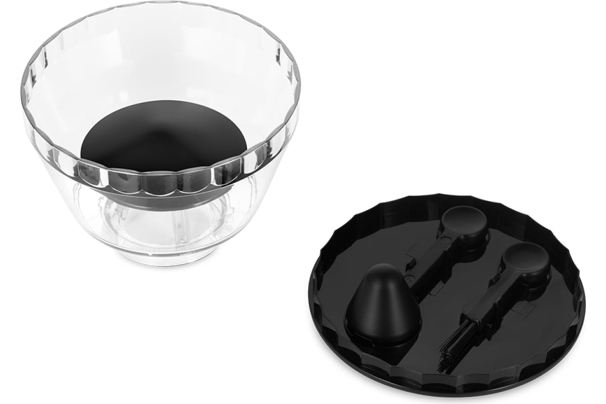 Для компактного хранения мерную ложку и щёточку для чистки можно хранить в крышке контейнера для зёрен. Благодаря мерной ложке удобно отмерять точное количество кофе, а щёточка помогает держать прибор в чистоте.