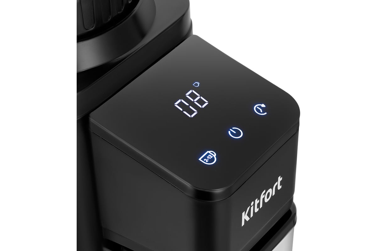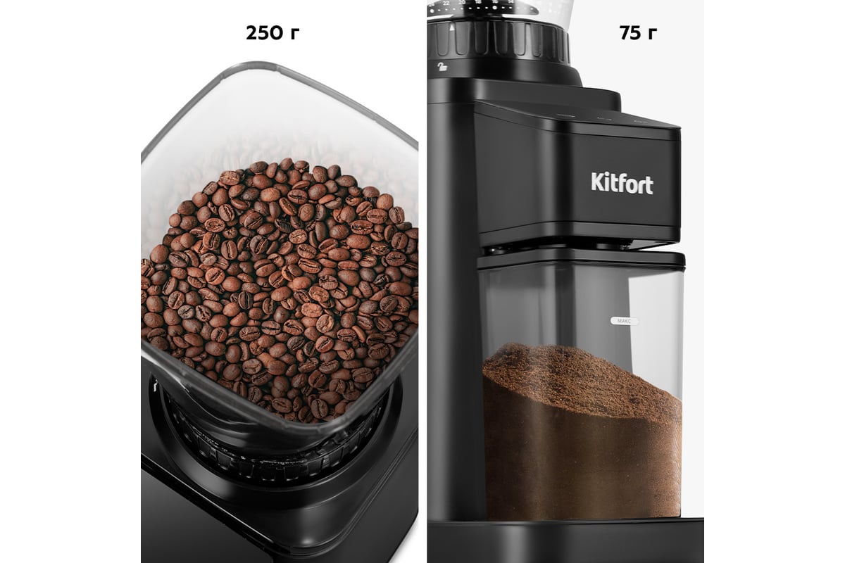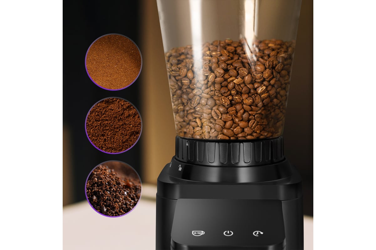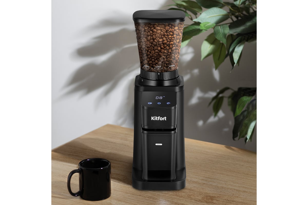 Вы можете выбрать, сколько порций кофе приготовить, и кофемолка автоматически остановится, смолов нужное количество кофе. Встроенный таймер также позволяет устанавливать время помола, которое отображается на LED-дисплее.
