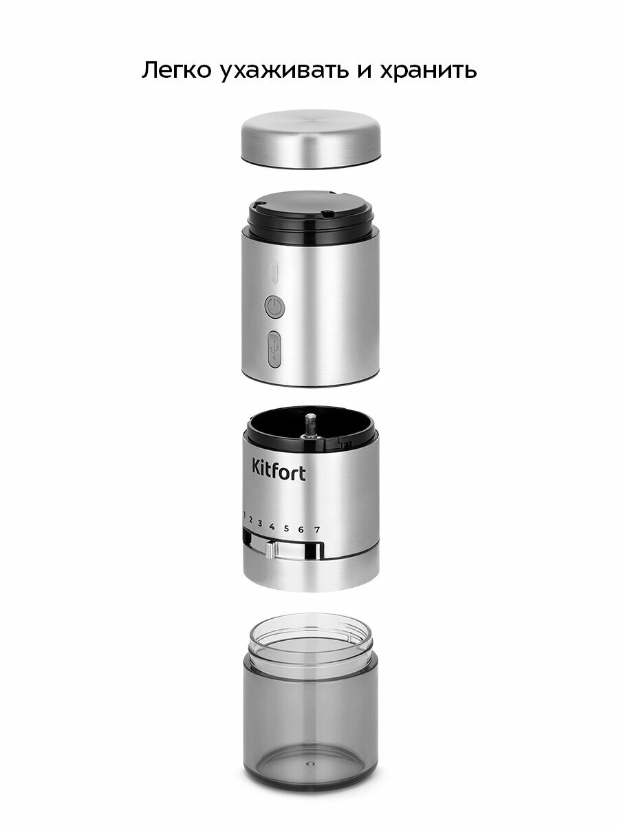 Разборная конструкция кофемолки обеспечивает её удобное хранение. Не забывайте мыть контейнер для зёрен перед каждой сменой сорта кофе, а для долгой службы устройства периодически очищайте механизм измельчения.