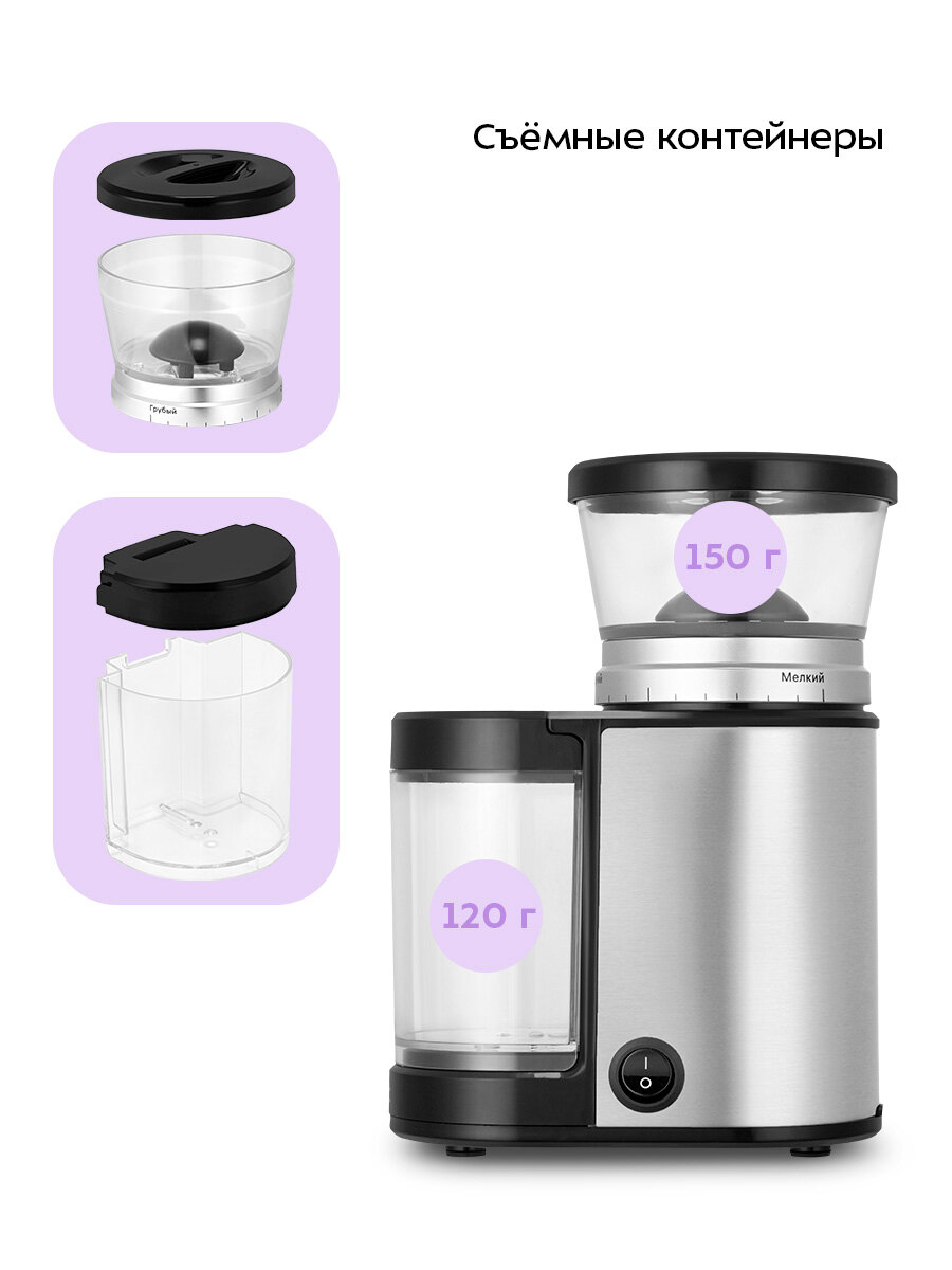 Контейнеры для молотого кофе (120 г) и зёрен (150 г) съёмные и оснащены крышками, надёжно сохраняющими свежесть. Удобные в использовании, они обеспечивают лёгкость в хранении и защиту кофе от внешних воздействий.